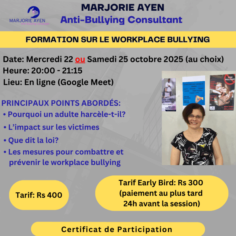 I am Marjorie Ayen and I am an Anti-Bullying Consultant from Mauritius. I experienced workplace bullying for 8 years. Now my aim is to raise awareness of bullying, promote bullying prevention and help victims and perpetrators heal. I am an Associate Member of the Anti-Bullying Alliance (ABA)(UK) since August 2022 and a Member of the Society for Human Resource Management (SHRM) since September 2025.